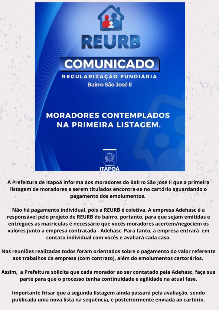 📢 Atenção, moradores! O processo de regularização fundiária segue avançando, e mais uma etapa importante já está em andamento. Seguimos trabalhando para garantir mais segurança jurídica, tranquilidade e valorização para as famílias.Fique atento aos próximos comunicados! 🏡✨ #RegularizaçãoFundiária #REURB #adehasc #itapoásc #santacatarina