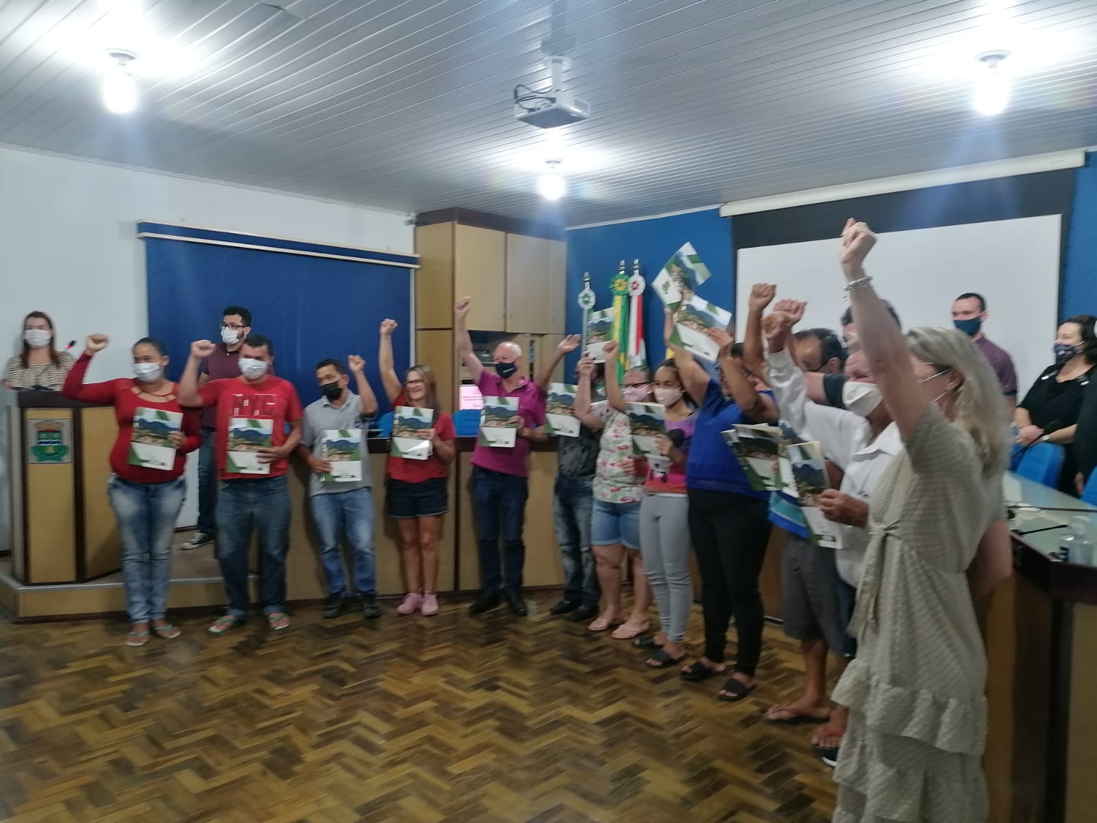 A entrega aconteceu nas dependências da câmara de vereadores de Apiúna, contou com a presença de autoridades, engenheiro da empresa ADEHASC e membros da comissão do Reurb.