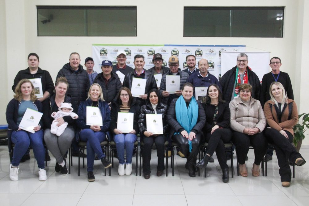 O secretário municipal de Administração, Rodrigo Jurck, a secretária de assistência social, Vera Lúcia Piotrowski Cubas, o representante da Adehasc, Altevir Feltrin e a coordenadora das ações de regularização fundiária no município, Gabrieli Halabura, também participaram da entrega de títulos de propriedade para os moradores do loteamento São Francisco II.