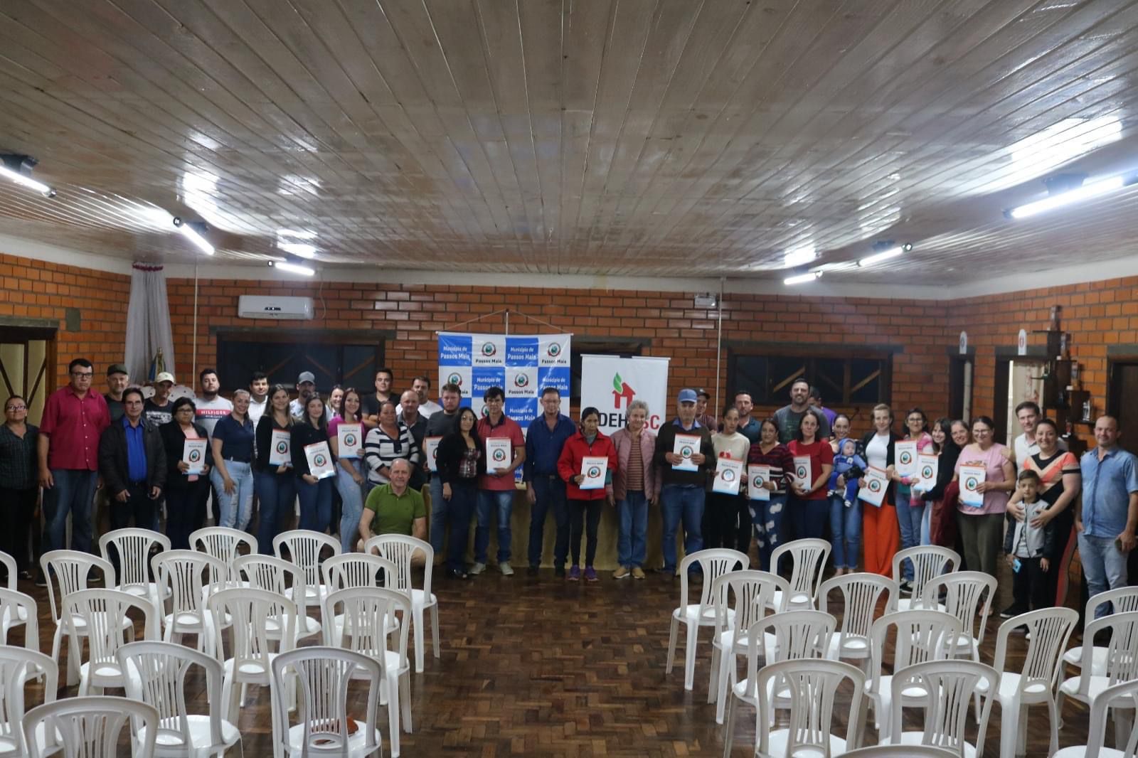 No último dia 23, a ADEHASC, junto com a prefeitura de Passos Maia, entregou os títulos de propriedade para os moradores do Núcleo Caixa d’Água, totalizando em 23 matrículas entregues, além da rua de acesso, que também foram regularizadas.